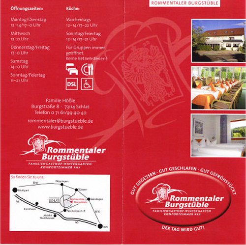 Sculpturelle Malerei der Künstlerin und Designerin Barbara Rauschenbach sehen Sie ab Mai 2010 im Hotel Rommentaler Burgstüble in Schlat Die Werke zeigen neue architektonische Darstellungen der Städte Göppingen , München und Zürich und weitere großflächige Arbeiten die im letzten Jahr im Atelier in Schlat entstanden und nach nationaler und internationaler Präsentation kehrt ein Teil der Arbeiten in die Ausstellung nach Schlat zurück , womit die Künstlerin ihre enge Verbundenheit zu ihrer jetzigen Wahlheimat bekundet. Gönnen Sie sich die Sehimpulse auslösende Kunst von Barbara Rauschenbach , deren Bilder ein Ausdruck der Lebensfreude und Euphorie schöner Dinge sind . Die Art der Präsentation der Kombination von Kunst und original schwäbischer Küche wird auch Sie in Versuchung führen. Die Ausstellung kann zu den regulären Geschäftszeiten besichtigt werden.